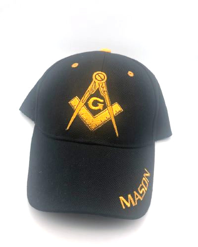 100% Acrylic Mason embroidered Black Hat with Velcro Back, Adjustable, One size fits most, Hand wash and air dry only.